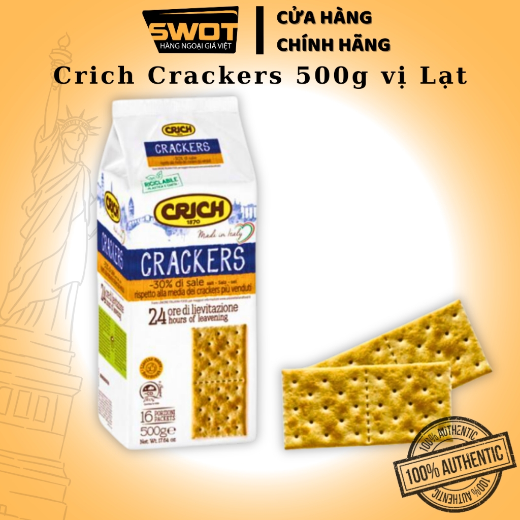 Bánh quy Crich Ý 500g, Bánh quy Crackers Ý cao cấp, giòn rụm, vị mặn vừa vị. thơm ngon hảo hạng, chính hãng Ý - SWOT ------------------ 1. THÔNG TIN SẢN PHẨM: Bánh quy giòn Crich Crackers Ý 500g - Xuất xứ: Ý - Italy - Thương hiệu: Crich - Trọng lượng: Gói 500g
